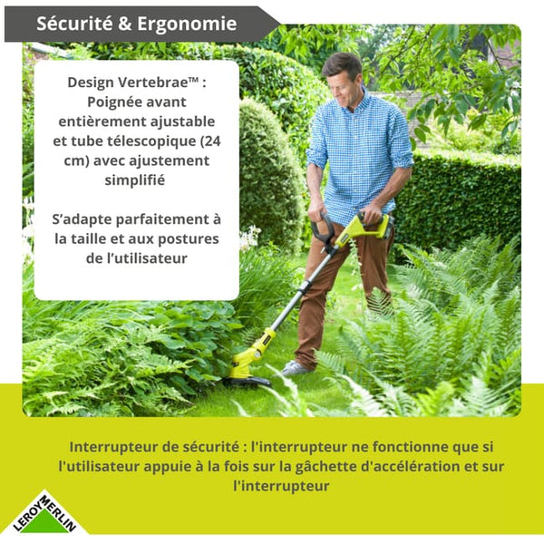 Coupe-bordures sans fil RYOBI One+ Rlt183225fpk, 18V, l.30 cm avec 1 batterie 2,5Ah. Livré avec 1 tête double lame avec 10 lames de rechange. Diamètre de coupe 25-30 cm - Tête de coupe automatique simple fil diamètre 1,6 mm - Tête inclinable 3 positions - Fonction dresse-bordures par simple rotation du tube - Tube télescopique (24 cm) avec ajustement simplifié - Inclus 1 batterie Lithium+ 2,5 Ah, 1 chargeur rapide 2 Ah.